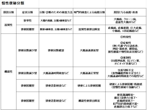 ・症候性:過敏性腸症候群、パーキンソン病、糖尿病、甲状腺機能低下症、神経筋疾患、膠原病、ヒルシュスプリング病、手術後腸閉塞(一時的)、神経系の異常(頭部外傷、痙攣性疾患など)
