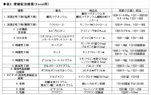 酸化マグネシウム(浸透圧性下剤)、ビーマス(浸軟性下剤と刺激性下剤の合剤)、アミティーザ(上皮機能変容薬)、リンゼス(過敏性腸症候群治療薬)を毎日服用