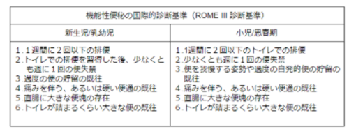 便秘には器質性と機能性がありましたが、「機能性」に焦点を当てたのがRome基準です。1990.年に、国際消化器病学会でRome基準が発表されたことが、これまで国や立場・見解によってバラバラであった機能性消化管障害の診断の統一化の第一歩となりました。詳しくは上のURLを参考にしてみてください。