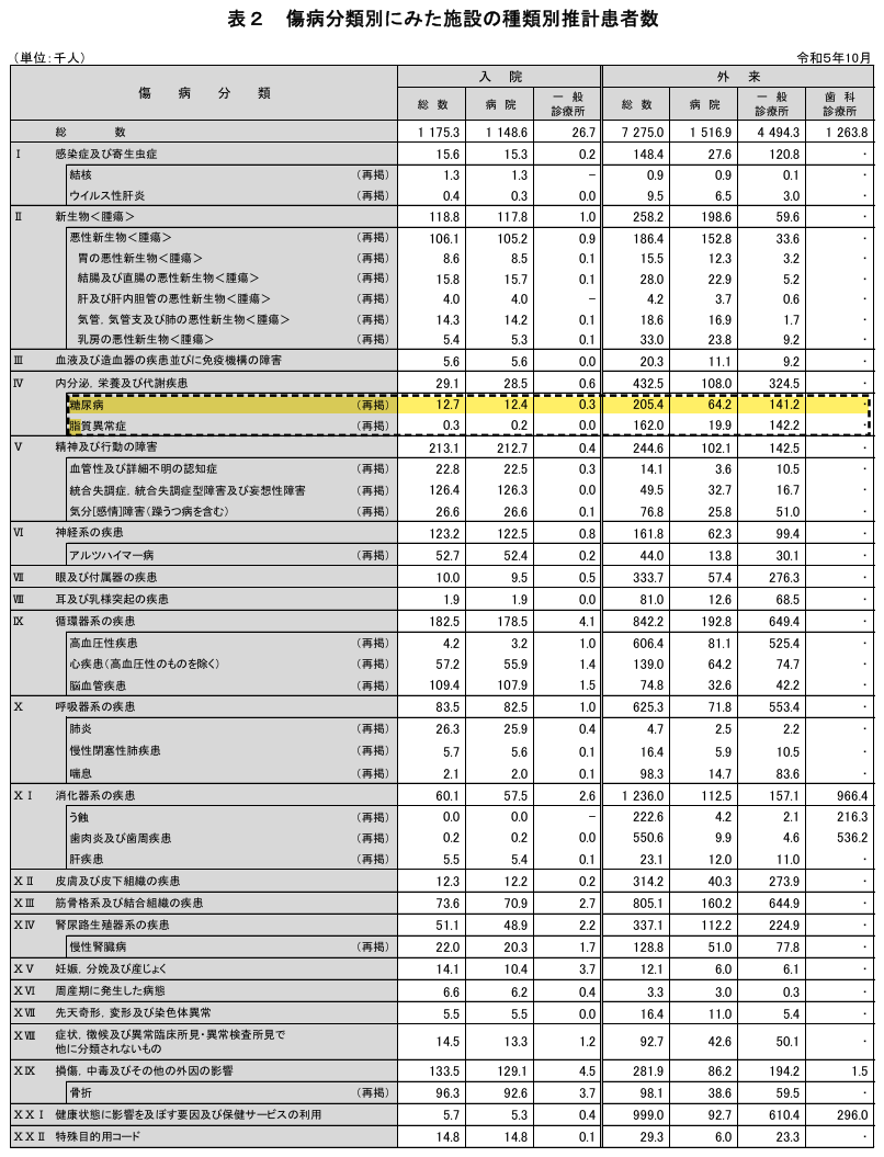 黄色のラインで引いてあるところが糖尿病です。入院では1000人あたり12人が、外来では1000人あたり205人が治療していることになっています。